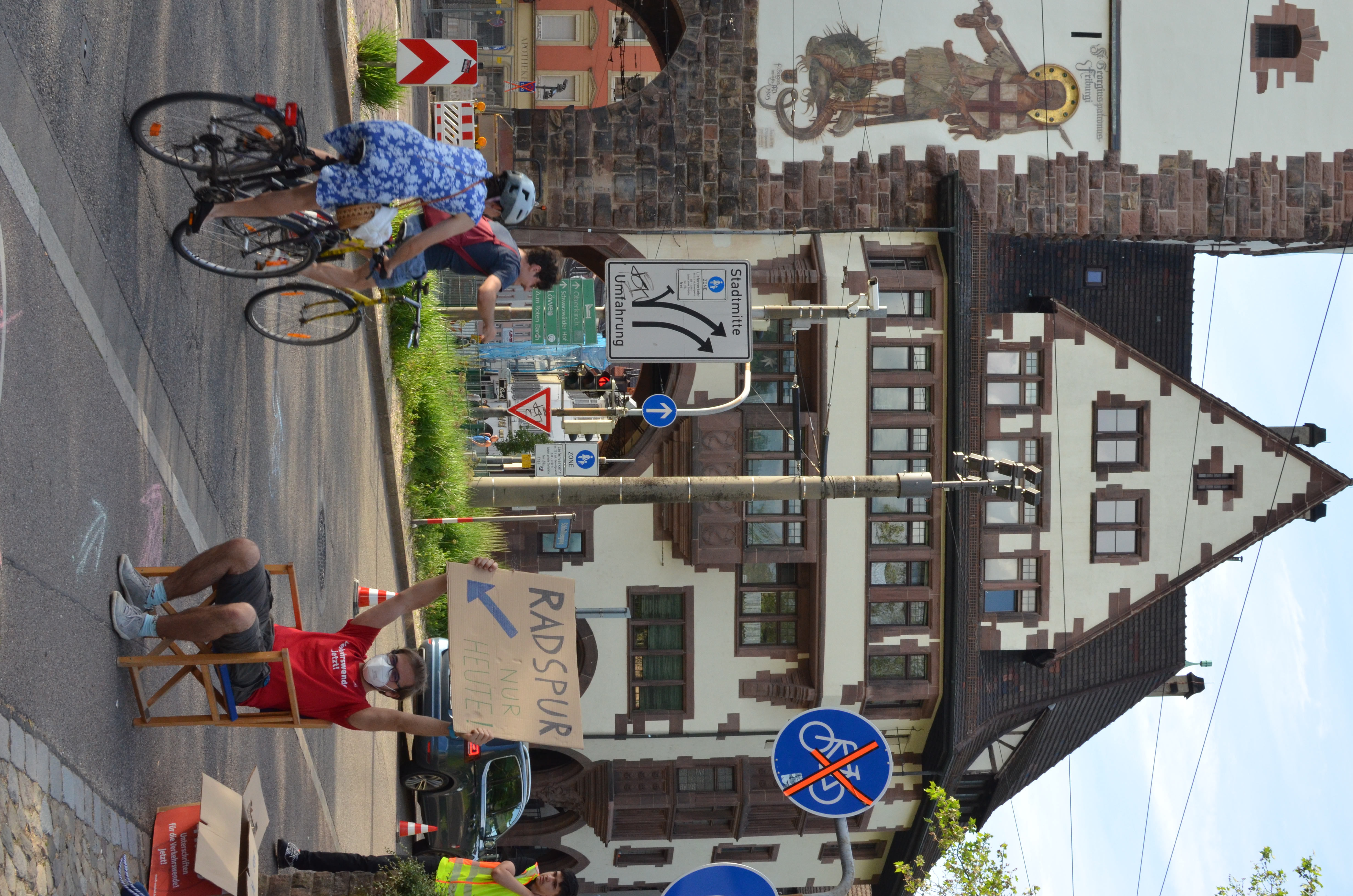 Beim Schlossbergring war, denke ich, ausschlaggebend, die Aktionsform vom Popup-Radweg. Wir haben dazu etwa drei mal die Autospur in einen Radweg verwandelt. Dazu haben wir das Versammlungsrecht genutzt, wodurch unter anderem die Verkehrssicherung und Verkehrsführung vom Popup-Radweg durch die Stadtverwaltung umgesetzt wurde. Konkret: Die Stadtverwaltung hat für uns Hütchen entlang der Straße aufgestellt, die die Fahrradspur markieren. Die Fahrradfahrenden konnten den Radweg dann nehmen, die Autos die andere verbleibende Spur.