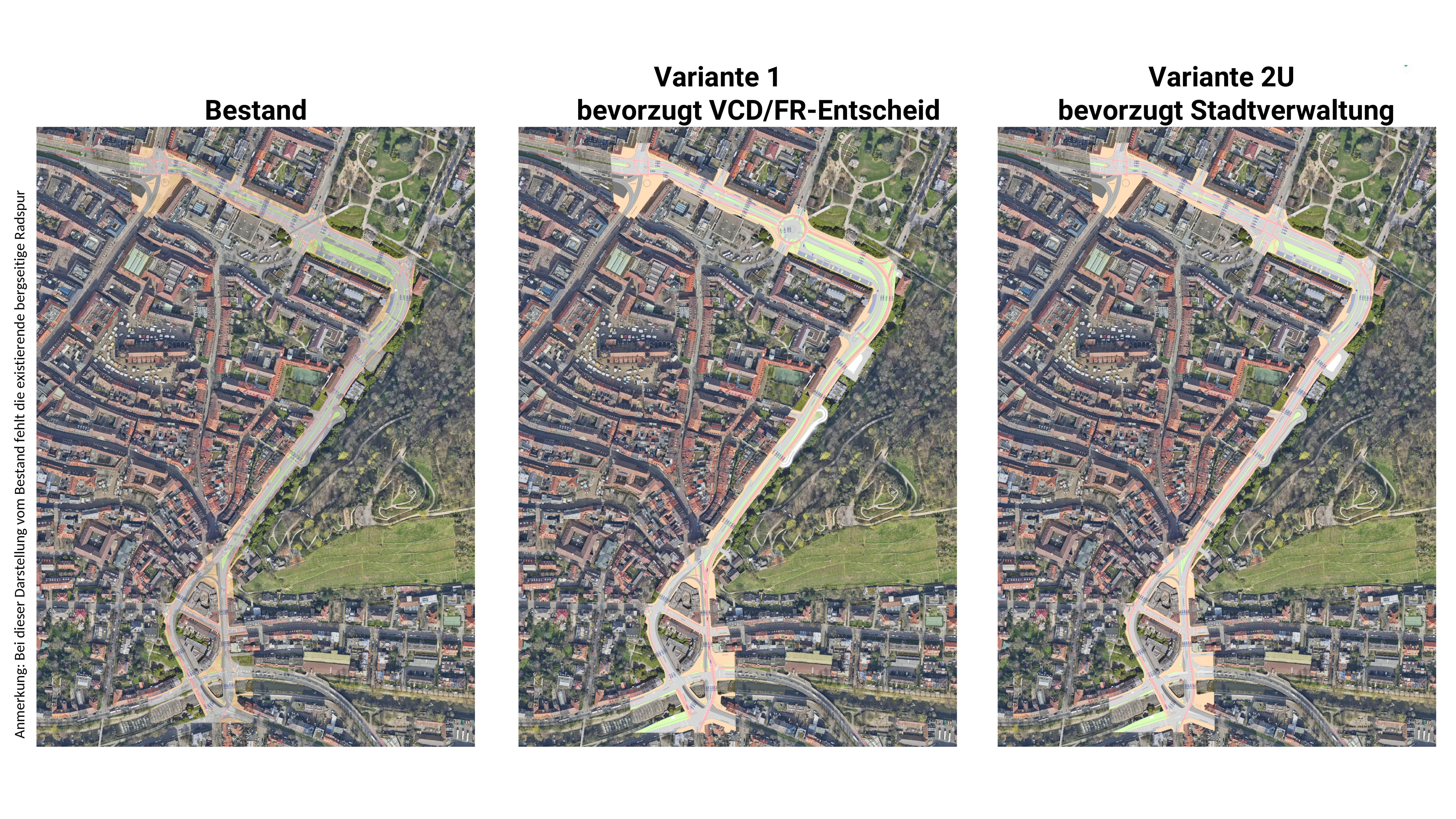 Variantenvergleich für den Schlossbergring.Hervorzuheben bei der VCD/FR-Entscheid Variante sind der Zweirichtungsradweg und der Kreisverkehr nach Niederländischem Vorbild