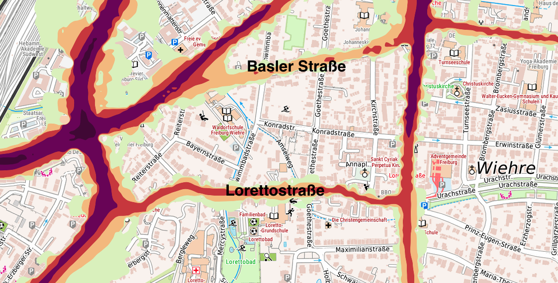 Lärmkarte der Stadt Freiburg vom Jahr 2022, Ausschnitt Wiehre.